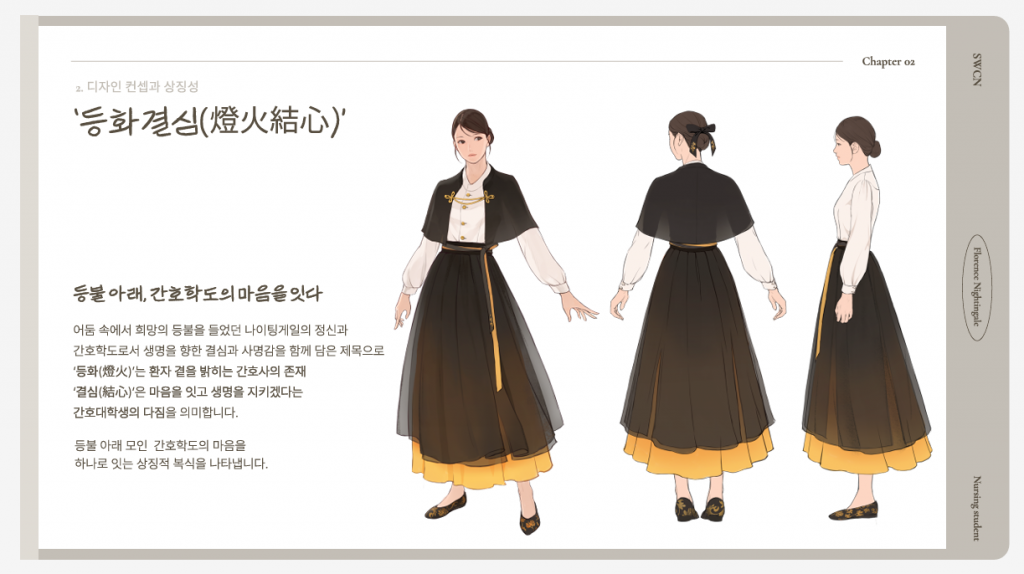 최우수상을 받은 새오름 팀(서지원, 이정원, 임서하, 정예은) 작품의 이름은 ‘등화결심(燈火決心)’이다. “나이팅게일이 어둠 속에서 등불을 들고 환자를 돌본 것처럼 간호학도로서 끝까지 나이팅게일 정신을 이어가겠다는 다짐을 한 벌의 복식으로 담아냈습니다. 등화결심은 전통과 현대의 조화를 기반으로 합니다. 한복의 요소를 현대적인 디자인으로 재해석하여 간호학도의 모습과 뿌리를 연결했습니다.”라고 작품을 설명했다.