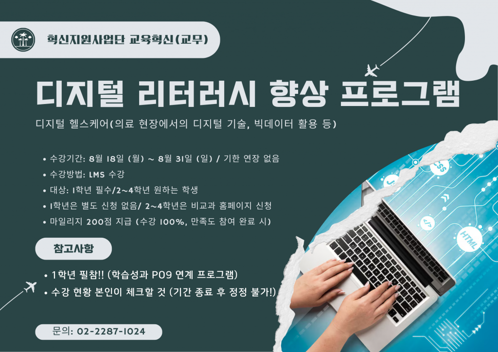 8월 18일부터 31일까지 전 학년을 대상으로 2025 전문대학 혁신지원사업 프로그램 ‘디지털 헬스케어 특강’이 진행됐다. 본 특강은 디케이메디인포 이동균 대표(전 간호사)의 동영상 강의를 LMS에 접속해 기간 내 자유롭게 시청하는 비대면 방식으로 운영됐다.